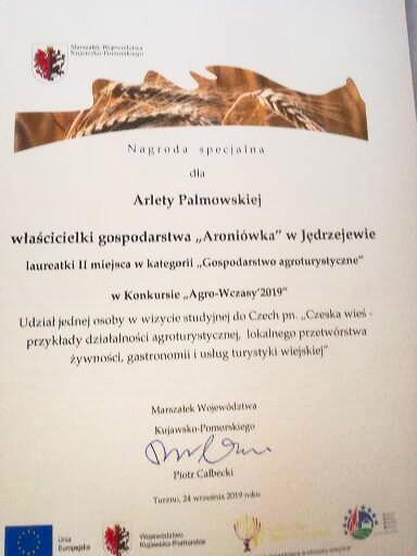 Gospodarstwo Agroturystyczne „Aroniówka” położone jest w Jędrzejewie, w gminie Lniano. Jesteśmy równocześnie hodowlą alpak i nasze zwierzaki umilają pobyt naszym gościom. Do dyspozycji gości mamy 2 pokoje z łazienkami, salon, dostęp do kuchni z osobną lodówką, taras i ogród z wyjściem do lasu. Cały teren (w tym parking) jest ogrodzony. Oprócz tego mamy domek letniskowy w typie holenderskim w pełni wyposażony z zabudowanym tarasem i widokiem na pastwisko alpak. Mini plac zabaw dla dzieci, rowery, miejsce na ognisko i grill.